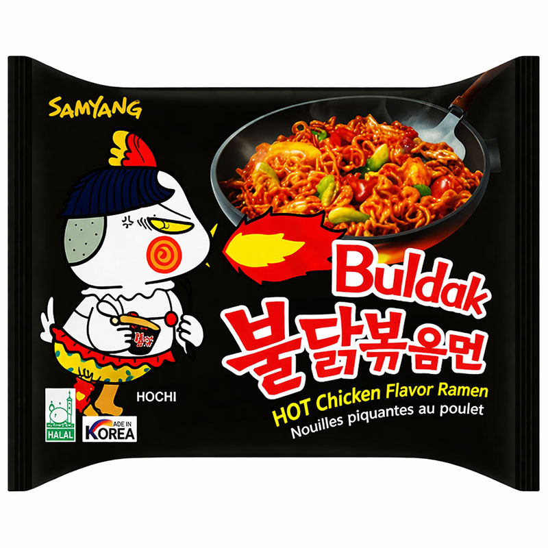Nouilles instantanées coréennes très épicées saveur poulet (“Hot Chicken”). Ce ramen sauté est connu pour son goût intense et pimenté, avec une sauce riche et relevée. Idéal pour les amateurs de sensations fortes et de plats rapides à préparer.