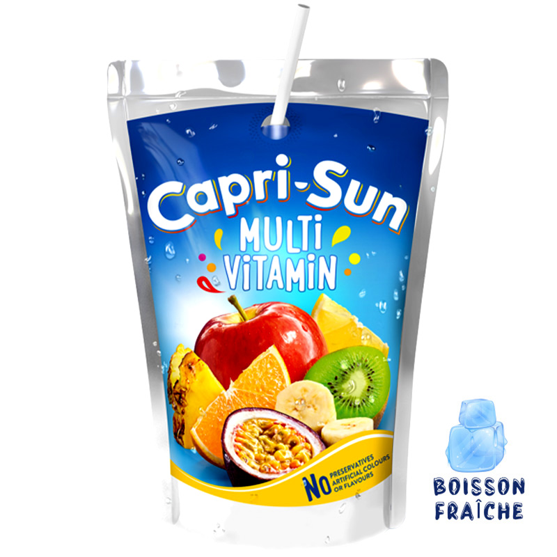 Boisson au jus de fruits Capri-Sun Multivitamin 200ml, une recette riche en vitamines avec des jus naturels de citron, orange, pomme, raisin, ananas, banane, kiwi, fruit de la passion en format de poche ! Sans conservateurs, sans arômes artificiels et sans colorants.