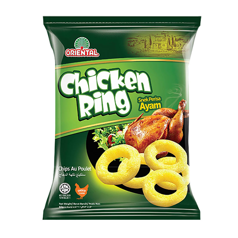 Chips au poulet croustillantes en forme d’anneaux, au goût savoureux de poulet rôti.