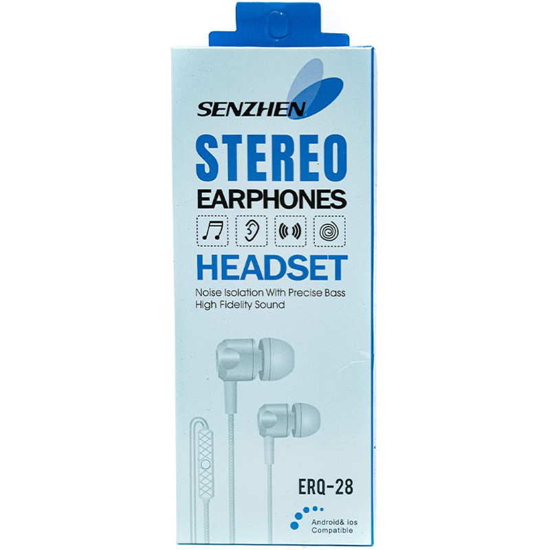 Écouteurs stéréo filaires SENZHEN ERQ-28 offrant une isolation du bruit, des basses précises et un son haute fidélité. Compatibles Android & iOS, avec micro intégré pour appels mains libres.