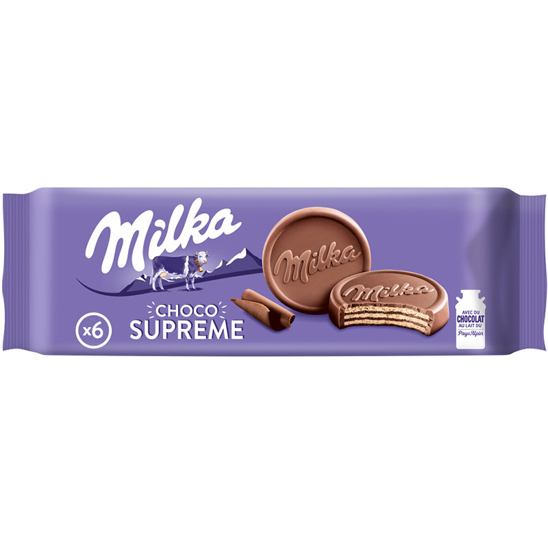 Gaufrette enrobée de chocolat au lait des Alpes (60%), garnie d’une délicieuse crème fondante au cacao. Un plaisir croustillant et fondant à chaque bouchée. Pochons individuels.